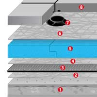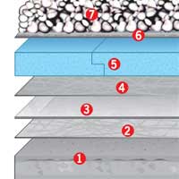 1. Бетонное основание. 2. Слой геотекстиля. 3. Гидроизоляционный слой. 4. Слой геотекстиля. 5. Слой теплоизоляции. 6. Слой геотекстиля. 7. Присыпка гравием. |