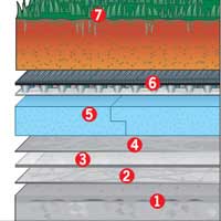 1. Бетонное основание. 2. Слой геотекстиля. 3. Гидроизоляционный слой. 4. Слой геотекстиля. 5. Слой теплоизоляции. 6. Дренажная мембрана 7. Грунт с растительностью. |