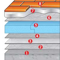 1. Бетонное основание. 2. Слой геотекстиля. 3. Гидроизоляционный слой. 4. Слой геотекстиля. 5. Слой теплоизоляции. 6. Слой геотекстиля. 7-8. Тротуарная плитка на цементной стяжке. |