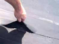 - Если количество вздутий менее 30% общей площади кровли производят локальный ремонт гидроизоляции: вздутие крестообразно разрезается, края отгибаются, поверхность под ним сушится и грунтуется. Затем края снова приклеивают с помощью газовой горелки, а на образовавшиеся швы наносят ремонтный полиуретановый состав с армированием.
